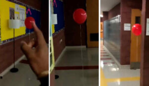 O vídeo mostra o que parece ser um “fantasma” seguindo-o enquanto ele limpava uma sala de aula após o horário